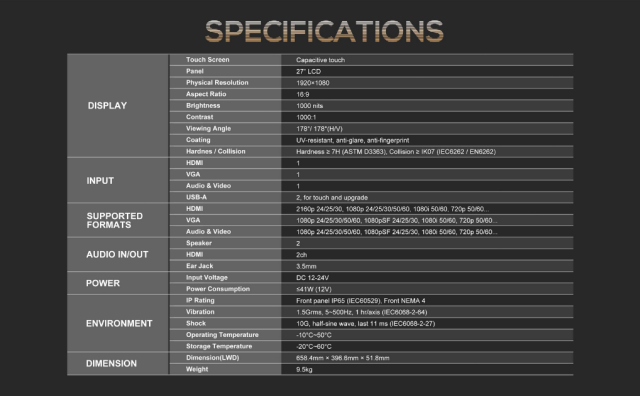 Der Lilliput TK2700-NP/C ist ein 27-Zoll-Monitor mit Metallrahmen und einem kapazitiven 10-Punkt-Touchscreen mit einer hohen Helligkeit von 1000 Nit. Er verfügt über HDMI-, VGA- und RCA/Composite-Eingänge, eine blendfreie/fingerabdruckabweisende/UV-beständige Beschichtung, eine handschuhfähige Touch-Funktion, eine wasser- und staubgeschützte Frontblende gemäß IP65/NEMA 4, eine Oberflächenhärte von 7H und einen Aufprallschutz nach IK07. Damit eignet er sich ideal für den robusten Einsatz im öffentlichen Bereich.