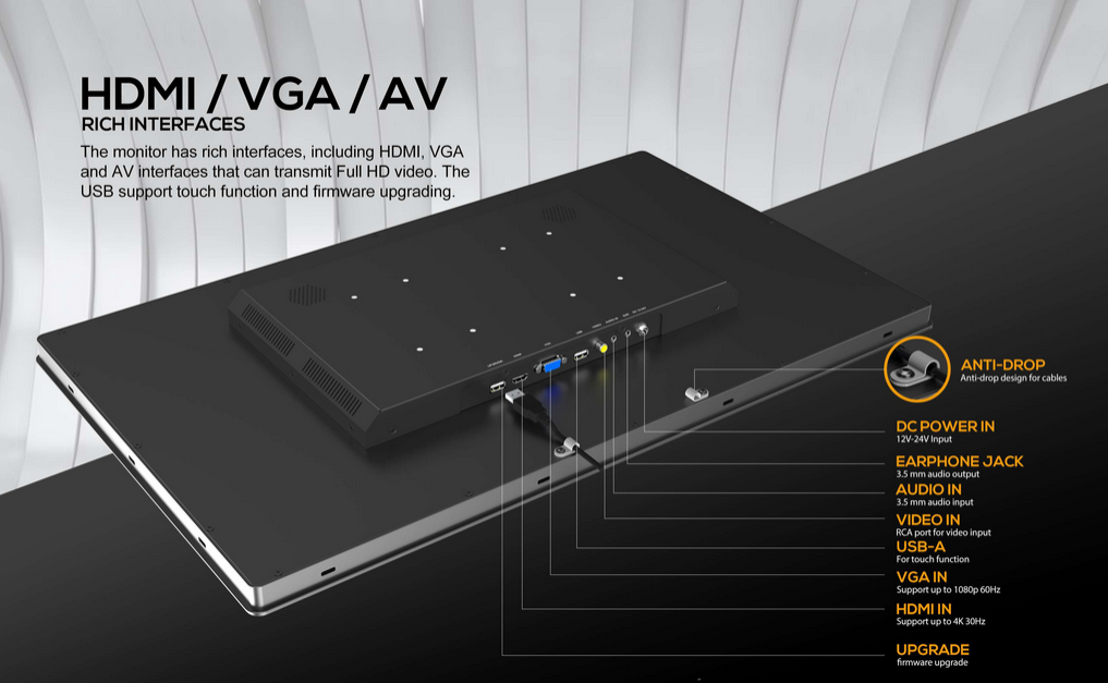 Der Lilliput TK2700-NP/C ist ein 27-Zoll-Metallmonitor – der größte der TK-Reihe von Monitoren mit Metallrahmen –, der mit einem kapazitiven 10-Punkt-Touchscreen und einem hochauflösenden Bildschirm mit 1000 Nits ausgestattet ist. Zu den Eingangsoptionen gehören HDMI, VGA und – für ältere Videoquellen – auch RCA-/Composite-Eingänge. Das Panel wurde speziell für dieses Monitormodell hergestellt und verfügt über eine Blendschutzbeschichtung, eine Anti-Fingerabdruck-Behandlung, um Verschmutzungen durch Berührungen des Monitors zu verhindern, sowie UV-Beständigkeit für eine klare Sichtbarkeit im Außenbereich. Die physikalischen Eigenschaften des Geräts sind beeindruckend und für den Einsatz in der Öffentlichkeit ausgelegt. Es unterstützt die Bedienung mit Handschuhen, verfügt über eine wasser- und staubgeschützte Frontblende nach IP65/NEMA 4, eine Härte von 7H und eine Schlagfestigkeit von IK07, was es zu einem soliden, robusten Monitor macht.