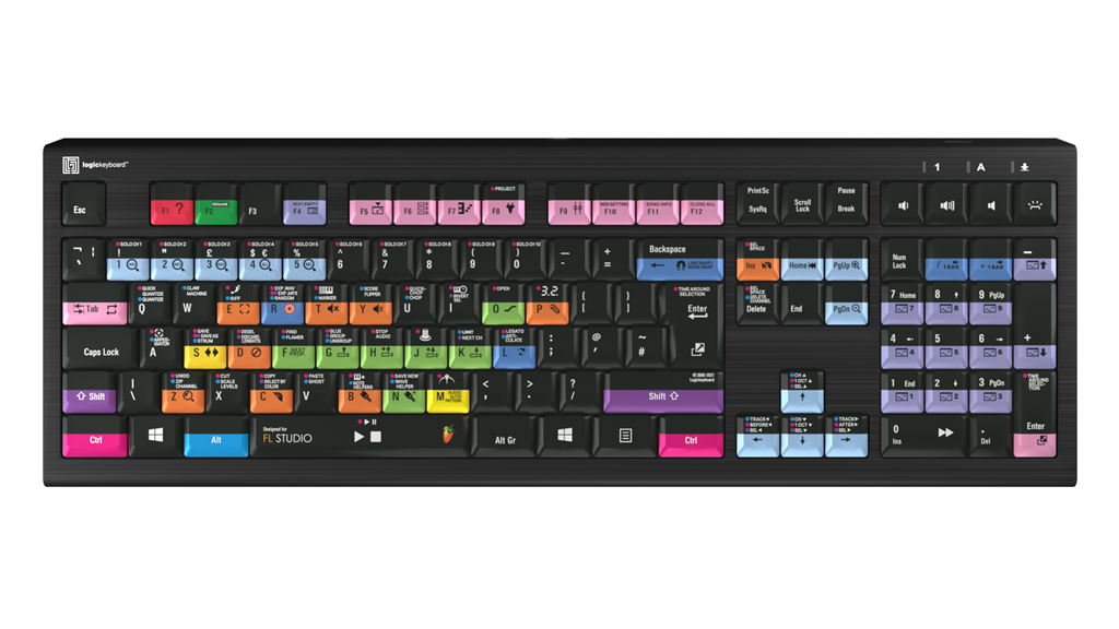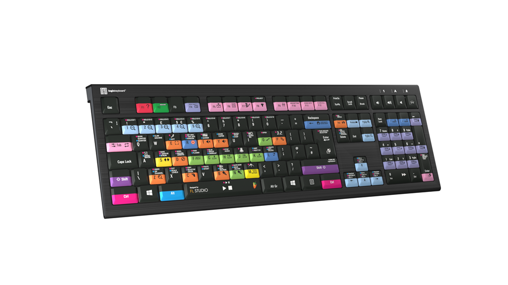 Das FL Studio Logickeyboard verfügt über alle Buchstaben, Zahlen und Symbole, die auch auf einer herkömmlichen Tastatur zu finden sind, und kann als Ersatz für diese verwendet werden. Die Tastatur ist einfach anzuschließen und erfordert keine Software-Installation.