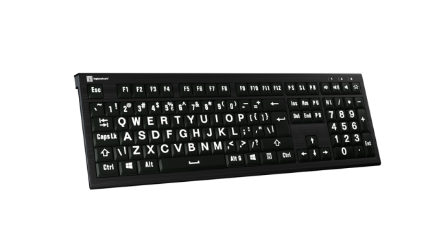 Unsere Largeprint-Tastaturen sind in verschiedenen Farbkombinationen erhältlich, um individuellen Bedürfnissen gerecht zu werden. So können die Benutzer eine Farbkombination wählen, die ihren Vorlieben entspricht. Diese Tastatur ist Weiß auf Schwarz.
