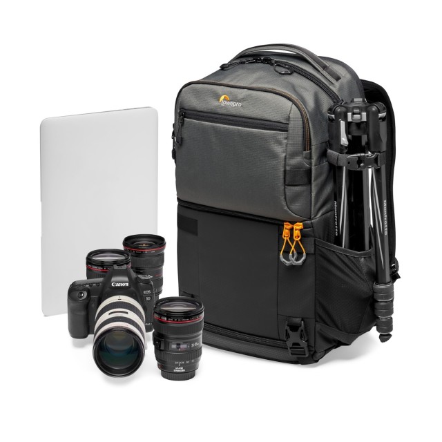 Der graue Rucksack Lowepro Fastpack Pro BP 250 AW III ist ein vielseitiger Rucksack mit zwei Hauptfächern, darunter ein Fotofach am unteren Teil des Rucksacks, das Platz für eine DSLR- oder spiegellose Kamera mit vier bis fünf Objektiven, einschließlich des aufgesetzten Objektivs, bietet.