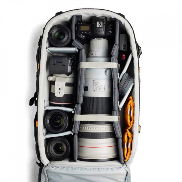 Das Hauptfach für die Kamera ist von der Rückseite zugänglich und so konzipiert, dass es maximalen Platz und variable Anordnungsmöglichkeiten bietet. Es fasst ein Objektiv bis zu 800 mm f/5,6 auf einer DSLR mit Porträtgriff oder ein CN20-Objektiv auf einem RED-Gehäuse für Naturfilmer sowie eine professionelle Drohnenausrüstung.