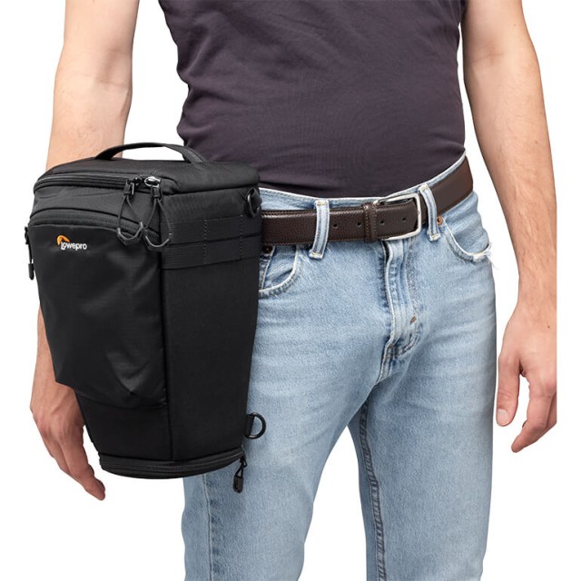 TopLoader passt auf Vollformat-Gehäuse mit Griff und Objektiv bis zu 70-200 mm F2,8, mit Erweiterung für Gegenlichtblende. Kompatibel mit SlipLock-Zubehör wie Objektivtaschen