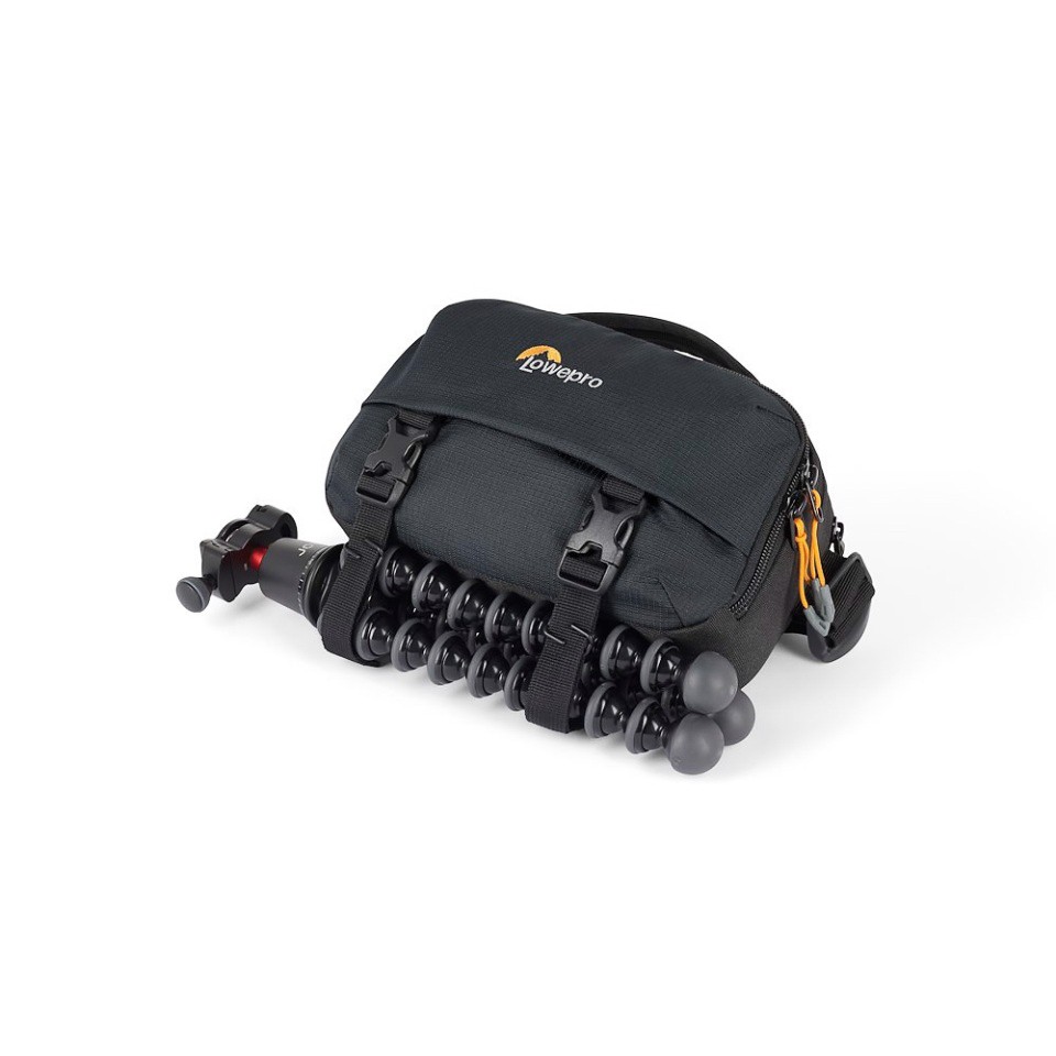 Die schwarze Lowepro Trekker Lite HP 100 Hip Pack Gürteltasche bietet Platz für eine kleine Kamera mit Crop-Sensor, wie beispielsweise die Sony Alpha 6400 oder eine ähnliche Kamera ohne Sucher, aber mit zwei kleinen Objektiven, oder eine Kompaktkamera und eine Action-Kamera.