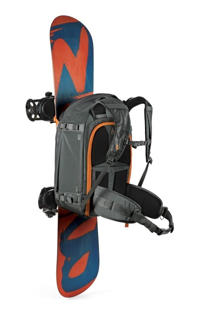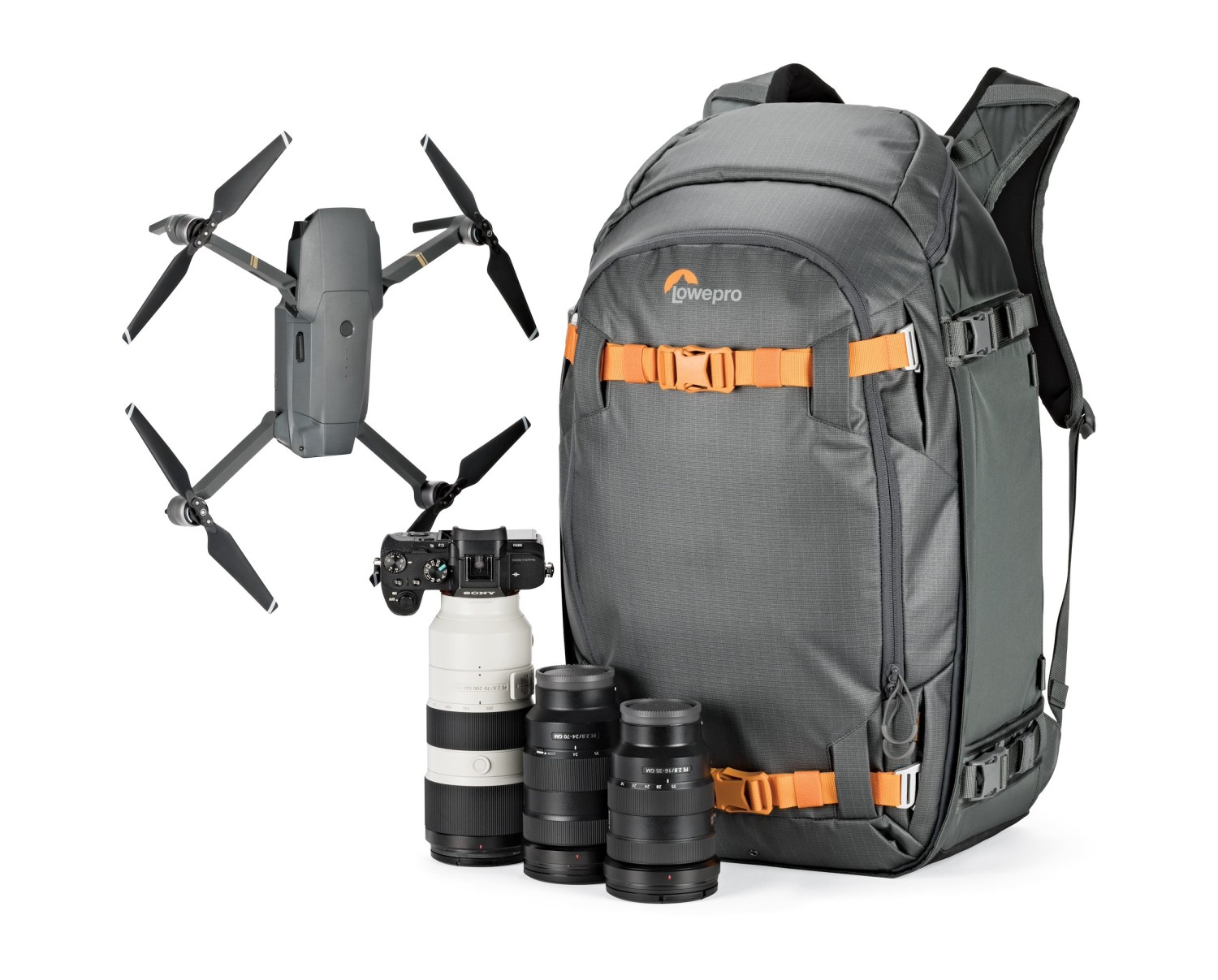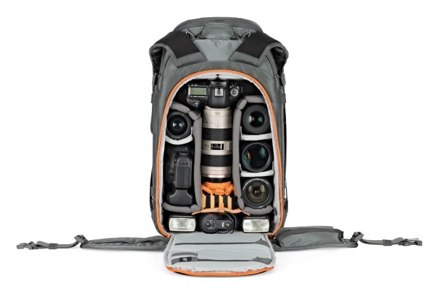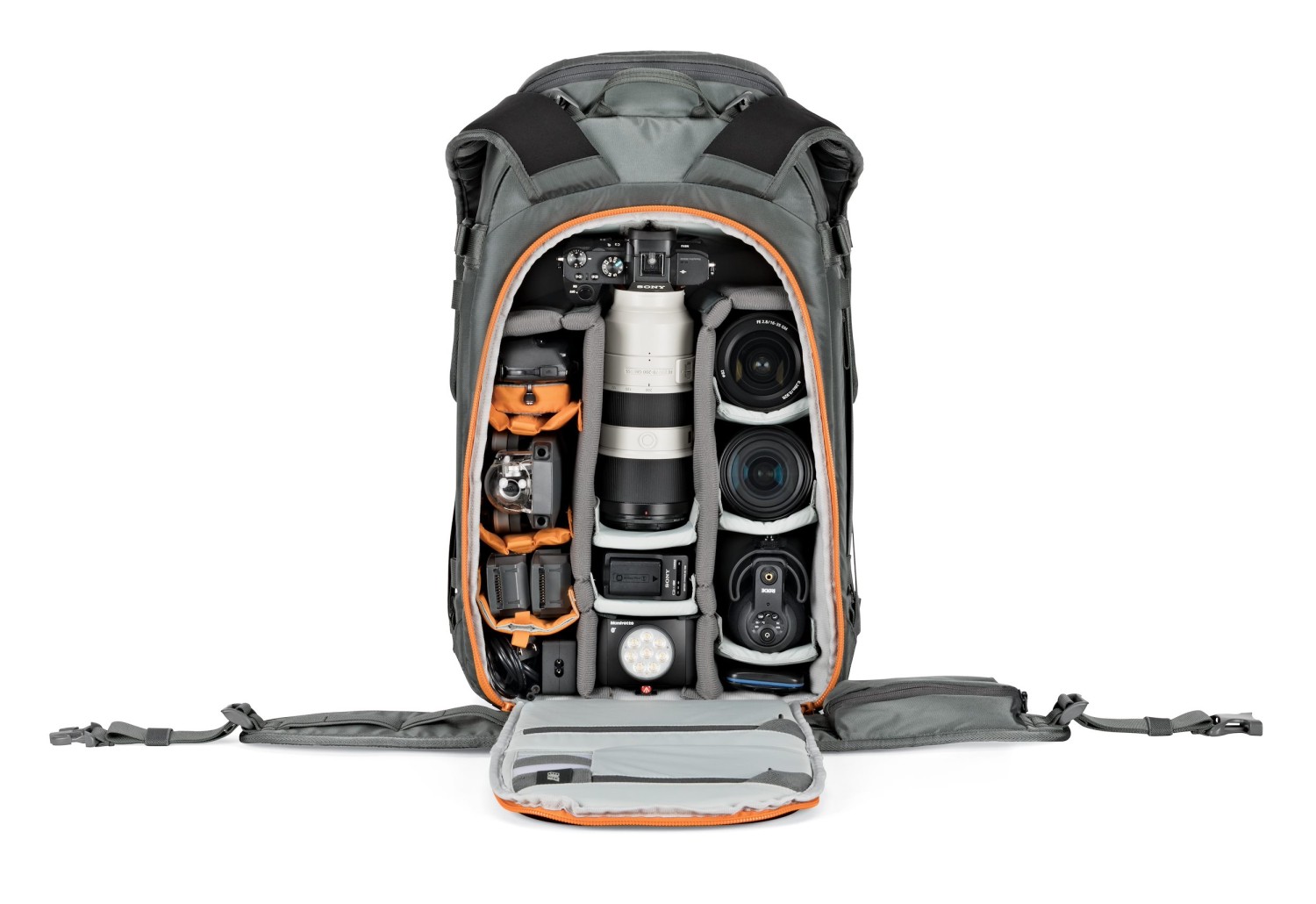 Der geräumige Innenraum bietet Platz für eine professionelle DSLR- oder spiegellose Kamera mit einem aufgesetzten 70-200-mm-Objektiv (f/2,8) sowie bis zu 8 weitere Objektive oder Zubehörteile, ein Ersatzkameragehäuse und Ausrüstung wie Actionkameras oder Drohnen. Dank des Zugriffs sowohl von oben als auch von der Seite können Sie schnell auf Ihre Ausrüstung zugreifen, ohne den Rucksack vollständig auspacken zu müssen. Die erweiterbare Fronttasche eignet sich perfekt zur Aufbewahrung von Bergsteigerausrüstung wie einer Schaufel, einer Sonde oder zusätzlicher Kleidung.