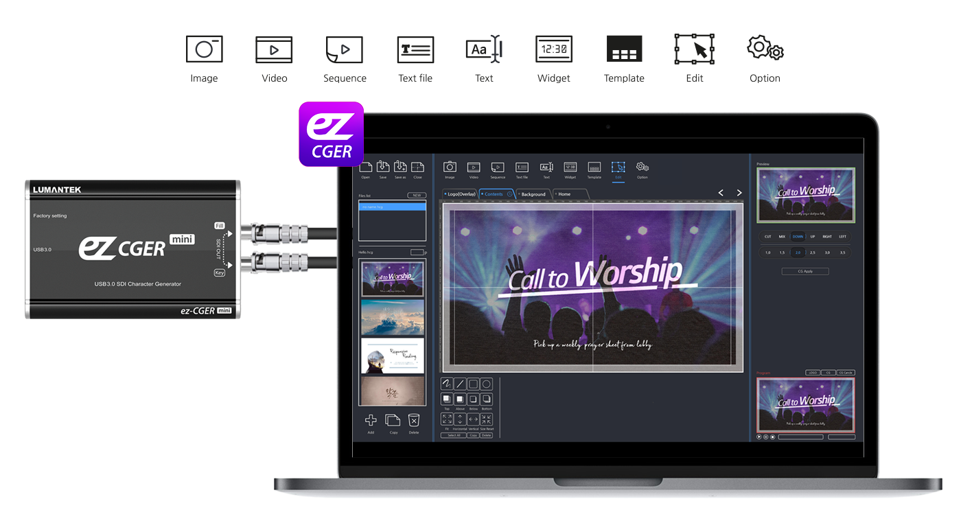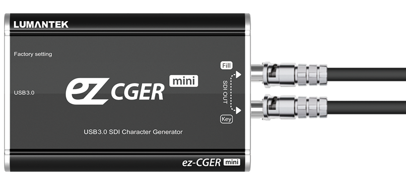 Mit seiner Mini-Konvertergröße und dem einfachen USB 3.0-Anschluss erzeugt der ez-CGER mini Fill & Key im SDI-Format. Schließen Sie diese an Ihren eigenen Video-Switcher an, um Ihr Video mit CG live zu übertragen! Fügen Sie Bilder, Videos, Textdateien und mehr mit LUMANTEKs spezieller Software ez-CGER ein.