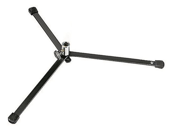 Die Manfrotto 003SPL Backlite Stand Base ist eine 1 kg schwere Mini-Spider-Basis aus schwarzem Stahl (ohne Säule oder Zapfen) mit einer festen Höhe von 9 cm, einer Tragkraft von 15 kg, drei rechteckigen Klappbeinen, 3/8"-Innengewinde und abnehmbarem 1/4"-20- oder 3/8"-16-Außengewinde – und bietet eine extrem niedrige, absolut stabile Halterung für Gegenlicht-, Kicker- oder Bodenbeleuchtung.