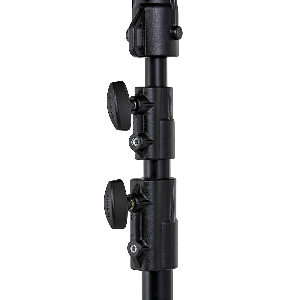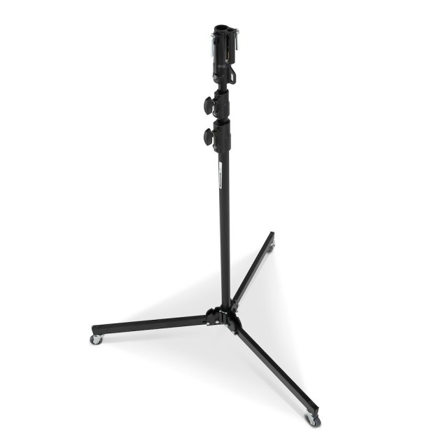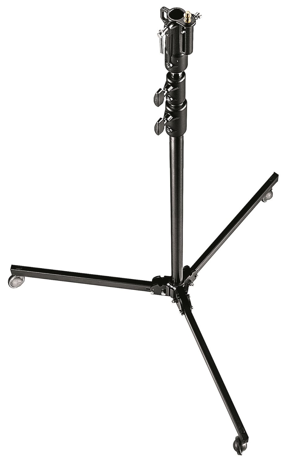 Der Manfrotto 298B Studio-Stativ aus schwarzem Aluminium mit 3 Segmenten ist ein 6 kg schweres professionelles Lichtstativ mit silber eloxierten Aluminiumsäulen (35/30/25 mm), schwarzem Stahl-Klappfuß auf gebremsten Rädern, einem Nivellierfuß und einer Tragkraft von 15 kg (5 kg bei voller Auszugslänge von 300 cm) – es bietet eine stabile, mobile Halterung für mittelgroße Studiolampen, Softboxen oder Overhead-Rigs.