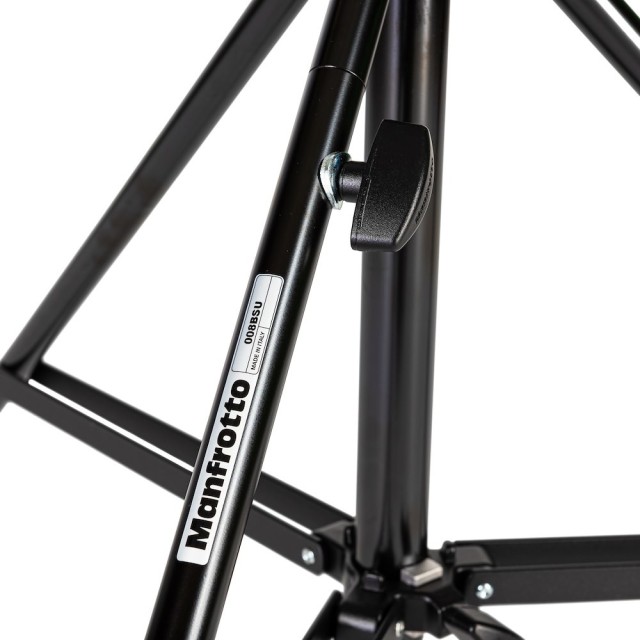 Der Manfrotto 008BSU Junior Stand vereint robuste Haltbarkeit mit intelligenter Technik in einem schwarz verzinkten Rahmen. Zwei Sektionen mit einer Steigleitung lassen sich über Kragenverschlüsse reibungslos auf eine maximale Höhe von 216 cm ausfahren, während doppelt verstrebte Rundbeine und eine Standfläche von 110 cm dafür sorgen, dass das Stativ unter einer Last von 30 kg nicht nachgibt. Der Universal-Kopf Typ 14 verfügt über eine 28-mm-Innengewindebuchse und einen 16-mm-Babybolzen mit Sicherheitsstift für jede Standardbefestigung.