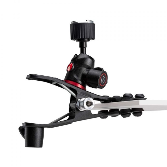 An der Klemme ist ein zuverlässiger Manfrotto-Kugelkopf mit mehreren Positionen und voller Schwenk- und Neigefunktion befestigt. Sobald die Klemme an der gewählten Oberfläche befestigt ist, kann der Benutzer mit einem einzigen Feststellknopf am Kugelkopf das Zubehör präzise im richtigen Winkel positionieren und mit einer einfachen Drehung fest arretieren. An der Oberseite des Kugelkopfes befindet sich Manfrottos hochgelobter Schuhhalterungsmechanismus. Diese einzigartige Halterung ermöglicht es dem Benutzer, sein gewähltes Zubehör einfach und sicher am Kugelkopf zu befestigen. Schrauben Sie einfach den Ring ab, um den Schuh zu öffnen, schieben Sie das Zubehör hinein und ziehen Sie dann den Ring fest, um es sicher am Kugelkopf zu befestigen.