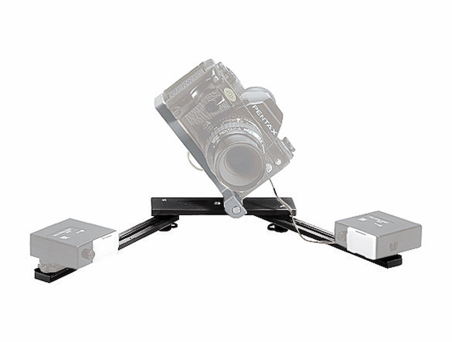 Die Manfrotto 330B Makrohalterung ermöglicht die Befestigung von zwei Blitzköpfen neben einer Kamera auf einem Stativkopf und bietet vielseitige Beleuchtungsoptionen für die Makrofotografie.