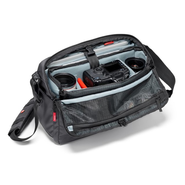 Die Manfrotto Manhattan Speedy-30 Messenger (MB MN-M-SD-30) ist eine stilvolle, urbane graue Kameratasche, die Platz für eine Vollformat-DSLR (z. B. Canon 5D Mark IV) mit einem 70-200 mm f/2,8-Objektiv sowie 3–4 zusätzlichen Objektiven, einem 14-Zoll-Laptop und einem 9,7-Zoll-Tablet. Sie verfügt über einen herausnehmbaren Flexy Camera Shell-Einsatz, eine versteckte Stativbefestigung, einen Fahrradstabilisierungsgurt, eine Trolleyhülle und vollständigen Wetterschutz.