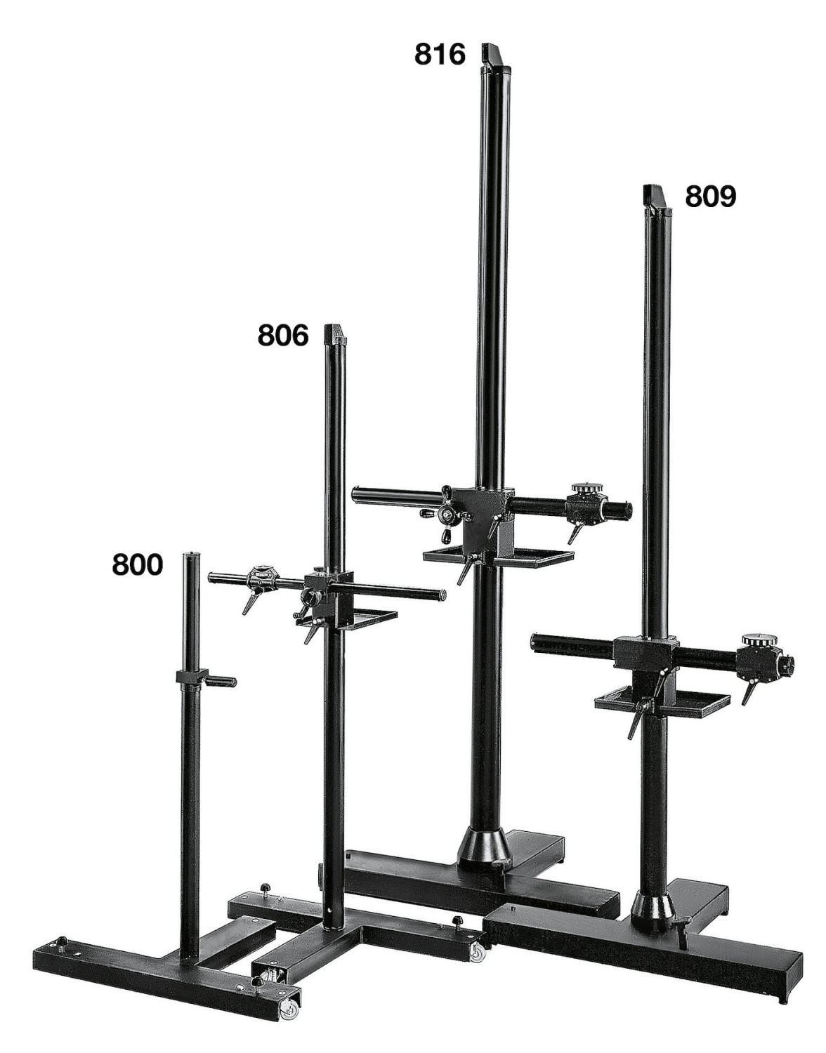 Die ausgewogene Säule aus schwarz eloxiertem Aluminium ist auf einem schweren Gusseisensockel mit den Maßen 84 x 55 cm montiert, der mit zwei drehbaren Rädern ausgestattet ist, die sich mit einzelnen Radbremsen fest arretieren lassen.