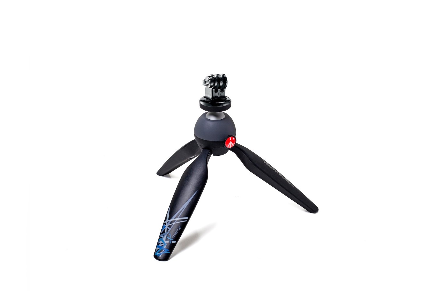 Manfrotto PIXI Xtreme Mini-Stativ mit GoPro-Adapter: Ultraportables 16 cm großes Tisch-/Handstativ mit Druckknopf-Kugelkopf, 1/4"-20-Schraube, Gummifüßen und spezieller GoPro-Halterung – trägt 1 kg bei einem Gewicht von 195 g in einem Edelstahl-/Adapto-Gehäuse.