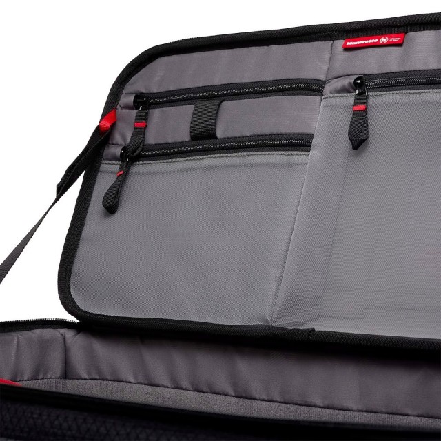 Dank ihrer rechteckigen Form und Abmessung bietet die Tasche unzählige Raumkombinationen und ist mit vier Außentaschen ausgestattet. Das vordere Organizerfach bietet Platz für eine Vielzahl von Zubehör wie Kabel und Notizblöcke. Die Rückentasche ist für Dokumente gedacht, während die beiden erweiterbaren Seitentaschen zusätzlichen Platz für weiteres Equipment bieten. An den Außenseiten der Vorder- und Rückentaschen befinden sich außerdem mehrere Schlaufen zum Befestigen und Aufhängen von nützlichen Gegenständen.