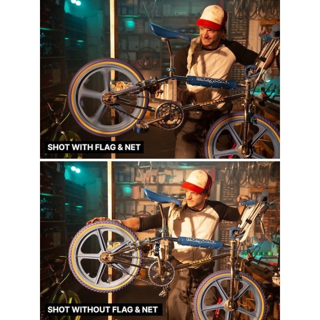 Ein weiteres wichtiges Merkmal der Rapid Flags ist der vielseitige Befestigungspunkt, der eine einfache Positionierung mit einer Reihe von Grifflösungen ermöglicht. Jeder Rahmen verfügt über eine 16-mm-Babyaufnahme und einen abnehmbaren 10-mm-Stahlbefestigungsstift, wodurch sich die Rapid Flags ideal für die Verwendung an Neigeköpfen, Tragarmen und Beleuchtungsstativen sowie an Griffköpfen und Verlängerungsarmen, wie sie bei Set-Staple-Produkten wie C-Stands verwendet werden, eignen