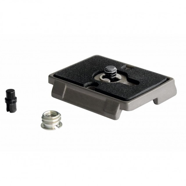 Manfrotto Schnellwechselplatte 200PL für einfache und schnelle Befestigung. Ausgestattet mit Standard 1/4" Gewinde, Reduzierung auf 3/8" und Gummigriff, um ein Abrutschen der Kamera zu verhindern.