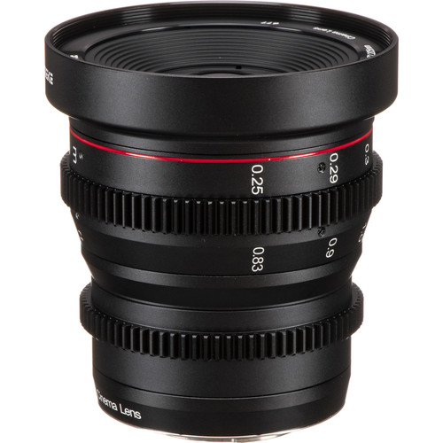 Zu den bemerkenswerten Merkmalen gehören eine Naheinstellgrenze von 9,8", ein Ganzmetall-Objektivtubus mit einer glatten, mattierten Oberfläche zur Temperaturkontrolle und ein Gesamtblendenbereich von T2,2 bis T,22.