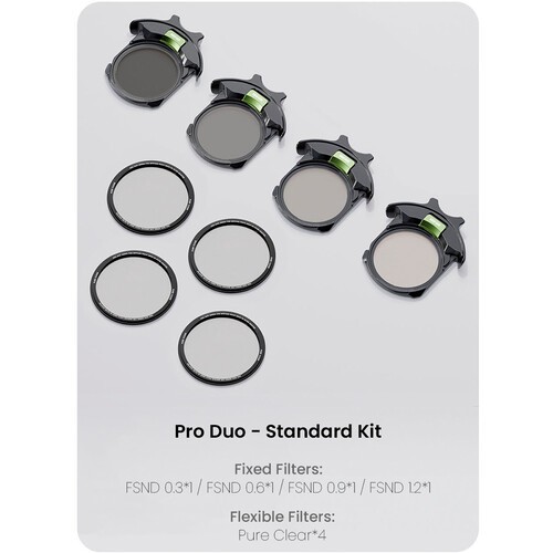 Vielseitige Kombinationsmöglichkeiten: Das zweiteilige Pro Duo-System ermöglicht es, jeden der enthaltenen festen ND-Filter mit einem der vier flexiblen Pure Clear-Filter zu kombinieren. Darüber hinaus können die Filter strategisch gestapelt werden, um eine höhere Lichtreduzierung zu erzielen, die mit zusätzlichen 1,2- Filtern (separat erhältlich oder im Advanced Kit enthalten) bis zu ND2,4 (8 Blendenstufen) erreicht werden kann.