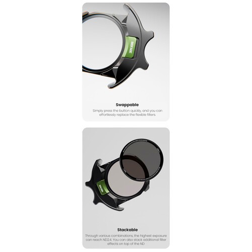 Unverzichtbare klare Einsätze: Die vier mitgelieferten Pure Clear Flexible Filter sind unverzichtbar, um den flexiblen Steckplatz zu füllen, wenn keine kreativen Effekte oder zusätzliche ND-Filter erforderlich sind, und gewährleisten den korrekten Objektivflanschabstand und die Fokusstabilität mit dem POCO-Adaptersystem.