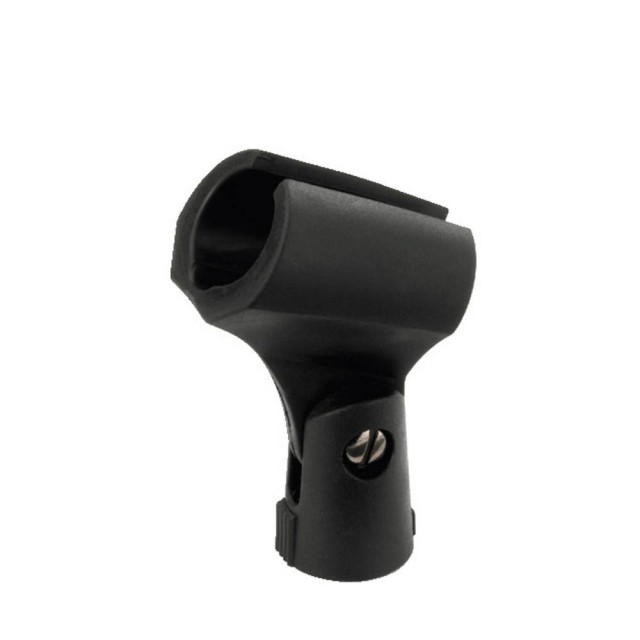 Mikrofonhalter aus schwarzem, flexiblem, starrem Kunststoff, mit einem Durchmesser von 25 bis 30 mm. Geeignet für Standard-Mikrofone, mit einem klassischen 16 mm (⅝") Gewinde.