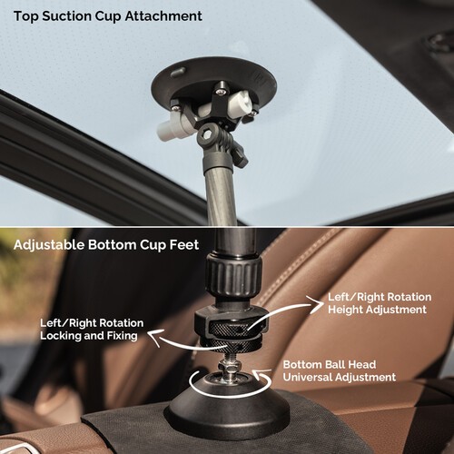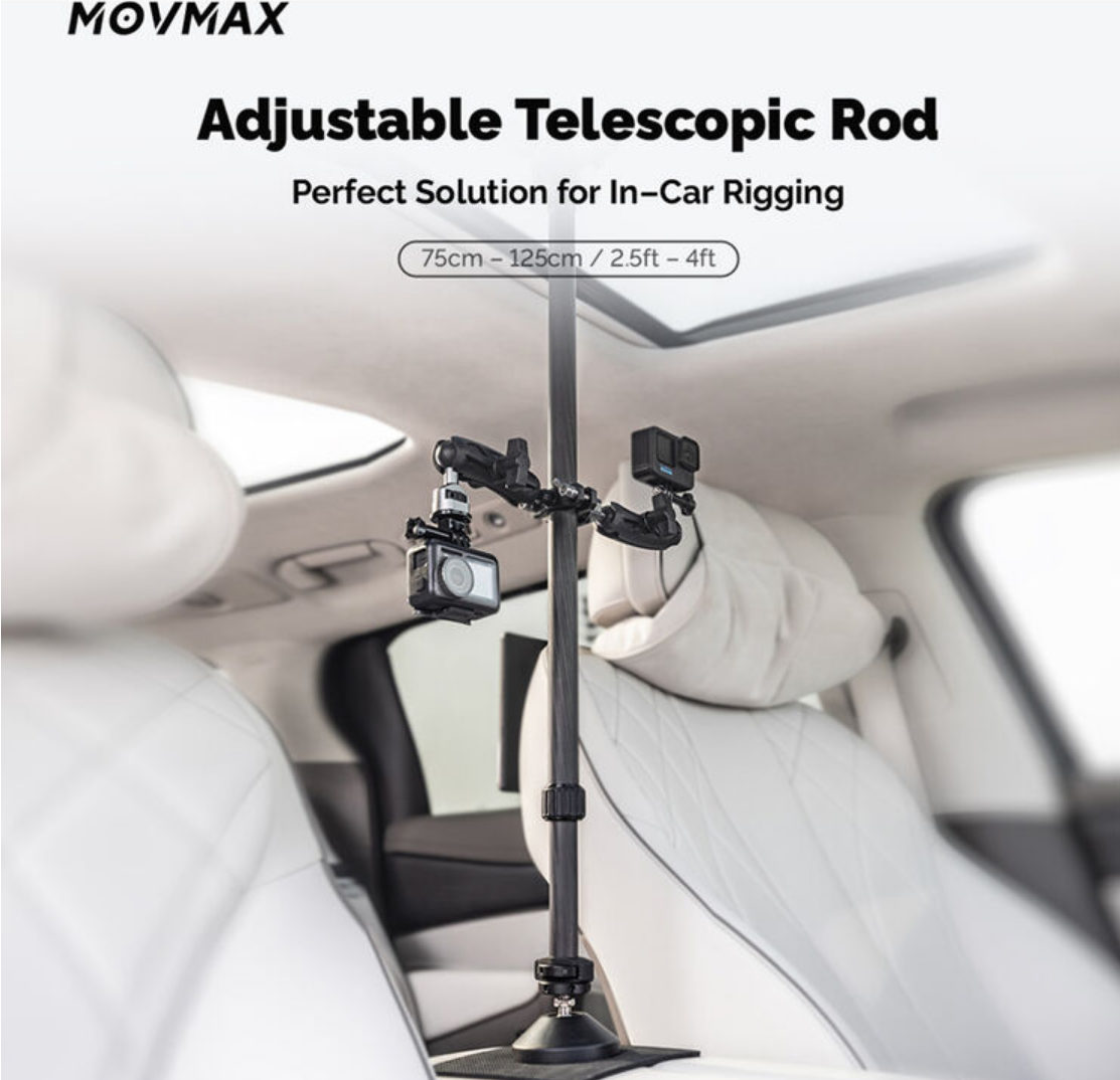 Die verstellbare Teleskopstange MOVMAX (2,5 bis 4') ist eine vielseitige Befestigungslösung für kreative POV-Aufnahmen im Fahrzeuginnenraum. Mit einer Arbeitshöhe von 75 bis 125 cm (2,5 bis 4') können Sie Ihre Kamera ganz einfach für einzigartige Fahrperspektiven positionieren. Die obere Saugnapfhalterung lässt sich sicher am Schiebedach oder an der Windschutzscheibe Ihres Autos befestigen, während der untere Saugnapf fest auf Ihrer Mittelkonsole aufliegt und für zusätzliche Stabilität sorgt.