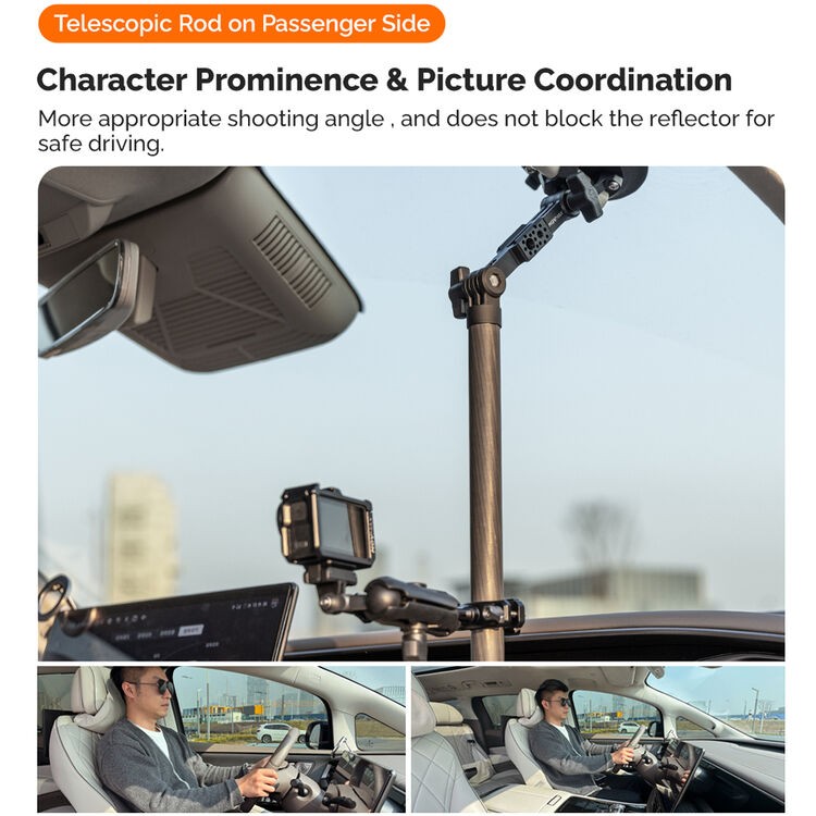 Die aus hochwertiger Kohlefaser gefertigte Stange gewährleistet Festigkeit und Langlebigkeit bei minimalem Gewicht. Sie unterstützt eine Reihe von stangenbasierten Zubehörteilen, darunter Kugelkopfhalterungen, Kamerahalterungen und andere Filmkomponenten, was sie zu einem flexiblen Werkzeug für Content-Ersteller und Filmemacher gleichermaßen macht. Ob Sie Reise-Vlogs, Action-Sequenzen oder filmreife Aufnahmen im Auto machen – diese Teleskopstange bietet eine zuverlässige Befestigungslösung, die einfach zu installieren und einzustellen ist.