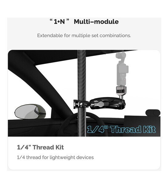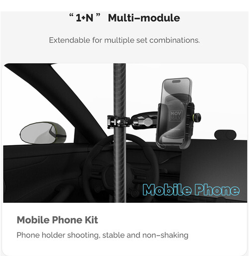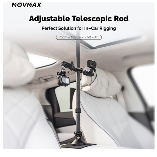 Die verstellbare Teleskopstange MOVMAX mit 3-Zinken-Halterung ermöglicht sicheres Filmen mit einer Action-Kamera im Auto durch die Windschutzscheibe. Sie lässt sich von 2,5 bis 4 Fuß ausziehen und verfügt über zwei Saugnapfhalterungen für das Schiebedach und die Mittelkonsole sowie einen mitgelieferten Kugelkopf-3-Zinken-Adapter, einen Doppelgelenkarm und eine Stangenklemme mit Kugelkopf für vielseitige Positionierungsmöglichkeiten.