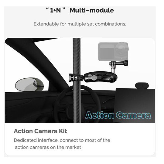 Die verstellbare Teleskopstange MOVMAX mit 3-Zinken-Halterung ist ein professionelles Kamerahaltesystem für Fahrzeuge, das für saubere, vibrationsfreie POV-Aufnahmen durch die Windschutzscheibe eines Fahrzeugs mit Actionkameras wie GoPro entwickelt wurde. Die robuste Teleskopstange aus Aluminium lässt sich stufenlos von 76 bis 122 cm verstellen, um sich an verschiedene Kabinengrößen anzupassen, und rastet in jeder Länge sicher ein. Das obere Ende verfügt über einen hochfesten Saugnapf, der zuverlässig am Schiebedach oder am Glas der Dachverkleidung befestigt werden kann, während der untere Saugnapf fest an der Mittelkonsole oder am Armaturenbrett verankert wird und so für höchste Stabilität bei hohen Geschwindigkeiten oder im Gelände sorgt. Dieses Kit enthält eine vollständige Gelenkausstattung: eine 3-fach-Halterung im GoPro-Stil mit integriertem Kugelkopf, einen Doppelkugelgelenkarm für 360°-Schwenk- und Neigebewegungen sowie eine spezielle Stangenklemme mit Kugelkopf zur Befestigung von Zweitgeräten oder zur Feinjustierung der Winkel. Das System ist ideal für Automobil-Content-Ersteller, Motorsport-Filmemacher und Vlogger und ermöglicht eine flexible, freihändige Kamerapositionierung mit minimaler Beeinträchtigung des Innenraums und maximaler kreativer Kontrolle.