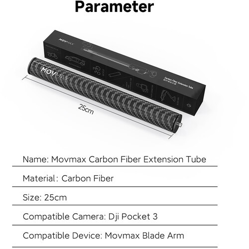 Das MOVMAX Carbon Fiber Extension Tube ist ein hochwertiges, ultraleichtes Zubehörteil, das entwickelt wurde, um die kreativen Möglichkeiten Ihres MOVMAX Blade Arm-Systems zu erweitern. Es ermöglicht mühelose Aufnahmen aus großer Höhe oder aus bodennahen Perspektiven, ohne zusätzliches Gewicht zu verursachen. Dieses starre Rohr aus hochfestem Carbonfaser in eleganter schwarzer Ausführung wiegt nur 72 g, bietet jedoch außergewöhnliche Stabilität und minimale Biegsamkeit für flüssige, professionelle Aufnahmen. Die integrierte 1/4"-20-Schraube sorgt für eine schnelle und sichere Befestigung am Blade Arm oder kompatiblen Halterungen und macht es zu einer idealen Lösung für dynamische Fahrzeugmontagen oder Handaufnahmen mit dem DJI Osmo Pocket 3. Mit einem Gewicht von nur 95 g in einer 28 x 5,6 x 3,8 cm großen Verpackung ist es perfekt für Reisen und spontane Filmaufnahmen geeignet. Beinhaltet eine begrenzte Herstellergarantie von 1 Jahr.