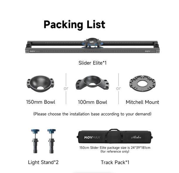 Der MOVMAX Slider Elite 35" wurde für präzise Filmaufnahmen entwickelt und ist ein professioneller Linear-Slider, der auf 89,9 cm langen, robusten Aluminiumschienen mit einem reibungsgetriebenen Schlitten basiert, der flüsterleise und flüssige Bewegungen ermöglicht – ideal für Dialogszenen, Produktpräsentationen oder subtile Einstellungsaufnahmen. Die integrierte Tracking-Plattform verfügt über eine 100-mm-Schalenhalterung zur sicheren Befestigung von branchenüblichen Halbkugel-Fluidköpfen und kann Lasten von bis zu 25 kg tragen, sodass spiegellose Kameras, DSLRs oder kompakte Cinema-Rigs mit Zubehör montiert werden können. Zwei mitgelieferte Lichtstativadapter mit 5/8-Zoll-Baby-Pin-Aufnahmen ermöglichen eine stabile Höhe auf C-Stativen oder Lichtstativen, während das Fehlen integrierter Füße die Flexibilität bei der Montage maximiert. Präzise Brems- und Dämpfersteuerknöpfe ermöglichen eine fein abgestimmte Widerstandskraft und Bremskraft für wiederholbare, kontrollierte Bewegungen. Trotz seiner robusten Bauweise sorgt die mitgelieferte gepolsterte Tragetasche für einfache Mobilität bei Außenaufnahmen. Mit einer begrenzten Garantie von 1 Jahr kombiniert dieser Slider Geräuscharmut, Stärke und nahtlose Integration für makellose horizontale Kamerabewegungen im Studio oder bei Außenaufnahmen.