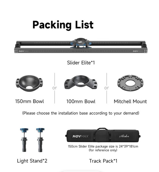 Der MOVMAX Slider Elite 70" wurde für präzise Filmaufnahmen entwickelt und ist ein professioneller Linear-Slider, der auf 70,8 Zoll langen, hochbelastbaren Aluminiumschienen mit einem reibungsgetriebenen Schlitten aufgebaut ist, der flüsterleise und flüssige Bewegungen ermöglicht – ideal für Dialogszenen, Produktvorstellungen oder subtile Einstellungsaufnahmen. Die integrierte Tracking-Plattform verfügt über eine 100-mm-Schalenhalterung zur sicheren Befestigung von branchenüblichen Halbkugel-Fluidköpfen und kann Lasten von bis zu 25 kg tragen, sodass spiegellose Kameras, DSLRs oder kompakte Cinema-Rigs mit Zubehör verwendet werden können. Zwei mitgelieferte Lichtstativadapter mit 5/8-Zoll-Baby-Pin-Aufnahmen ermöglichen eine stabile Höhe auf C-Stativen oder Lichtstativen, während das Fehlen integrierter Füße die Flexibilität bei der Montage maximiert. Präzise Brems- und Dämpfersteuerknöpfe ermöglichen eine fein abgestimmte Widerstandskraft und Bremskraft für wiederholbare, kontrollierte Bewegungen. Trotz seiner robusten Bauweise gewährleistet die mitgelieferte Tragetasche eine einfache Mobilität für Arbeiten vor Ort. Dieser Slider kombiniert Geräuscharmut, Stärke und nahtlose Integration für makellose horizontale Kamerabewegungen im Studio oder bei Außenaufnahmen.