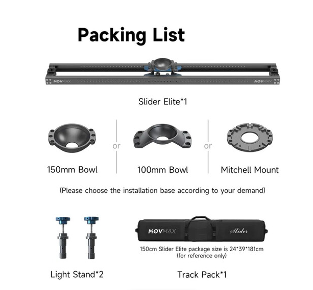 Der MOVMAX Slider Elite 70" wurde für präzise Filmaufnahmen entwickelt und ist ein professioneller Linear-Slider, der auf 179,8 cm langen, robusten Aluminiumschienen mit einem reibungsgetriebenen Schlitten basiert, der flüsterleise und flüssige Bewegungen ermöglicht – ideal für Dialogszenen, Produktpräsentationen oder subtile Einstellungsaufnahmen. Die integrierte Tracking-Plattform verfügt über eine 150-mm-Schalenhalterung zur sicheren Befestigung von branchenüblichen Halbkugel-Fluidköpfen und kann Lasten von bis zu 25 kg tragen, sodass spiegellose Kameras, DSLRs oder kompakte Cinema-Rigs mit Zubehör verwendet werden können. Zwei mitgelieferte Lichtstativadapter mit 5/8"-Baby-Pin-Aufnahmen ermöglichen eine stabile Höhe auf C-Stativen oder Lichtstativen, während das Fehlen integrierter Füße die Flexibilität bei der Montage maximiert. Trotz seines Verpackungsgewichts von 56 lb sorgt die mitgelieferte gepolsterte Tragetasche für einfache Mobilität bei Außenaufnahmen. Dieser Slider wird durch eine 1-jährige Garantie abgesichert und kombiniert Geräuschlosigkeit, Stärke und nahtlose Integration für makellose horizontale Kamerabewegungen in Studio- oder Außenproduktionen.