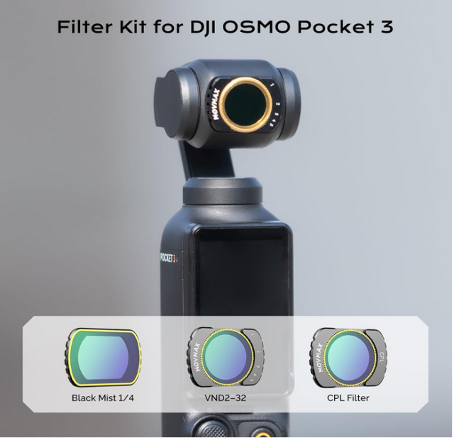 Sada magnetických filtrů MOVMAX pro DJI Osmo Pocket 3 Creator Combo obsahuje variabilní filtr ND2-32 (1–5 clonových stupňů), otočný filtr CPL a difuzní filtr Black Mist 1/4 – všechny se magnetickým uchycením pro okamžité použití – plus ochrannou fólii na LCD displej, které zajišťují filmovou kontrolu, jas bez odlesků a snové efekty zjemnění pleti v dynamickém osvětlení bez nutnosti rekalibrace gimbalu.