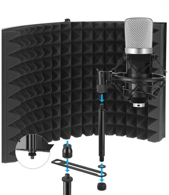 Moses Mshield - akustische Abschirmung, um ein klares Signal ohne Rauschen zu gewährleisten. Ideal zum Ersetzen von Gesang, Podcasts, Voice-overs usw. Die Innenwand besteht aus hochwertigem, geräuschabsorbierendem Akustikschaum, die Außenwand ist mit einer Aluminiumstruktur für sicheren Transport und Lagerung versehen. Der Schirm kann auf einem Mikrofonständer montiert werden.