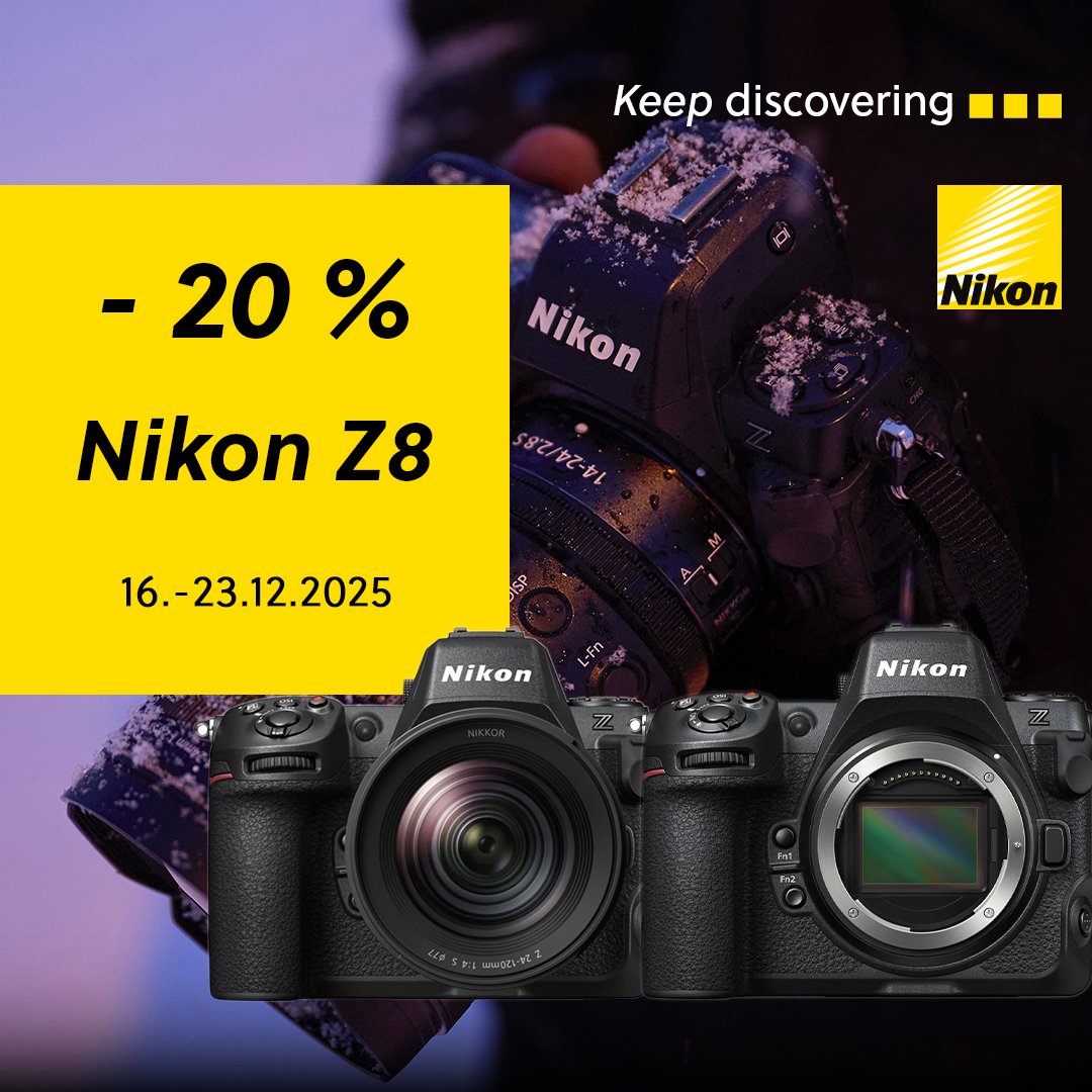 Die gesamte Kampagne „Sparen Sie mit Nikon“läuftbis Januar, aberfür das Modell Nikon Z 8 und das Kit Z 8 + NIKKOR Z 24-120 f/4 Sbieten wir Ihnen einen exklusiven zusätzlichen Rabatt von 20 %! Dieser gilt bis zum23. 12. 2025.