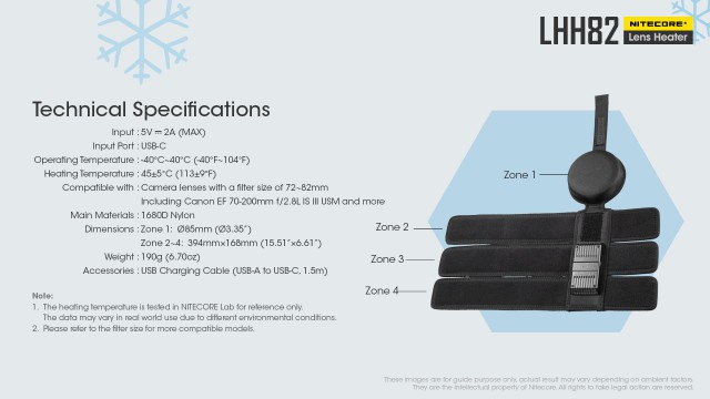 Eine beheizte Streulichtblende ist ein notwendiges Zubehör für Aufnahmen bei kalten Temperaturen und/oder hoher Luftfeuchtigkeit, da sie einen wesentlichen Schutz gegen das Beschlagen der Linse darstellt. Sie umhüllt das Objektiv (mit einem Filterdurchmesser von ca. 72~82 mm) vollständig und bietet so maximalen Wärmeschutz durch Erwärmung auf ca. 45°C (Erreichen einer Temperatur von ca. 10-15 Min.). Die Nylonhülle hält Temperaturen von -40-40°C stand und ist mit einer USB-C-Schnittstelle für die Stromversorgung (max. 5V/2A) mit externen Netzteilen einschließlich Batterien (nicht im Lieferumfang enthalten) und einem 1,5 m langen USB-A/USB-C-Kabel mit gebrochenen Steckern ausgestattet, das Temperaturen bis -20°C standhält. Ideales Zubehör für Dokumentarfilme, Astrofotografie usw.!