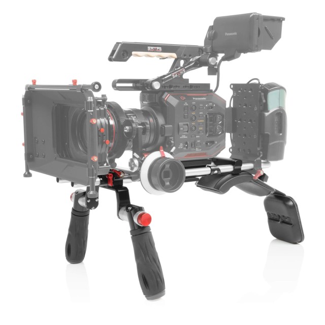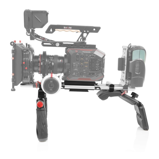 Die Schulterhalterung von SHAPE ist ein Schulter-Rig-System mit leichter Unterstützung (LWS) für die Panasonic AU-EVA1 Kamera. Es umfasst eine EVAB15 Grundplatte mit Rod Bloc, einen HAND5 Quick Handle mit Rod Bloc und Push-Button System, ein Paar 15 mm 18″ Stangen und eine Schulterpolsterauflage.