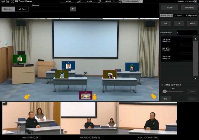 Optionale PC-Zusatzanwendung PTZ Control Center für die Fernsteuerung von Panasonic Installationskameras. Sie ermöglicht es, eine Gruppe von Kameras über einfache visuelle Voreinstellungen zu steuern: Durch Anklicken einer Voreinstellung werden die Kameras auf eine bestimmte Position gesetzt, was z. B. die Abwicklung von Konferenzen erheblich erleichtert, insbesondere für Benutzer, die keine Erfahrung mit Kameratechnik haben.