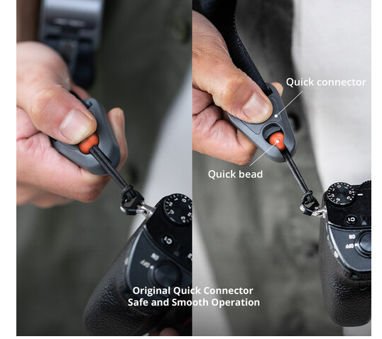 Jeder Gurt verfügt über einen Schnellverschluss und ein magnetisches Verriegelungssystem, das die Gurte bei Nichtgebrauch sicher hält. Die Verbindungsschlaufe besteht aus drei Schichten UHMWPE, darunter eine verschleißfeste Außenschicht, eine Innenlage mit Verschleißanzeige und ein tragfähiger Kern, der bis zu 198 lb sicher trägt. Mit den Schnellverstellern können Sie den Gurt in Sekundenschnelle mit nur einer Hand feinjustieren, sodass Sie Ihre Kamera ganz einfach in der perfekten Höhe tragen können.
