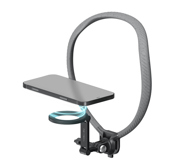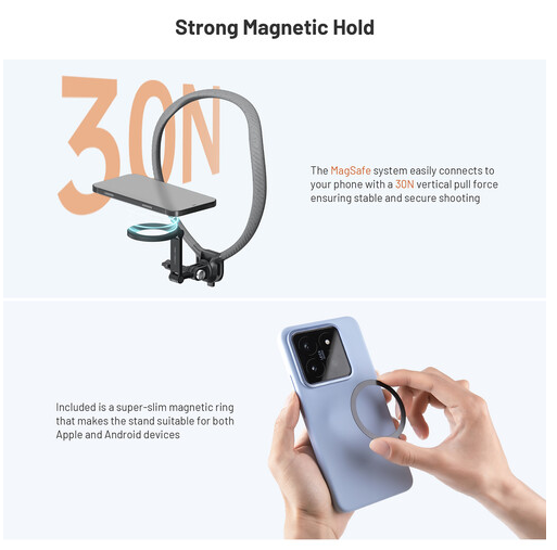 Ausgestattet mit dem magnetischen CapLock-Schnellverschlusssystem hält die Halterung Smartphones mit MagSafe oder magnetischen Befestigungsringen sicher und ermöglicht ein schnelles Anbringen oder Abnehmen. Ein Gelenkarm rastet fest in seiner Position ein und ermöglicht so eine präzise Bildausrichtung. Für zusätzliche Vielseitigkeit ist eine Actionkamera-Halterung im Lieferumfang enthalten, die mit Kompaktkameras wie GoPro- und DJI-Modellen kompatibel ist.