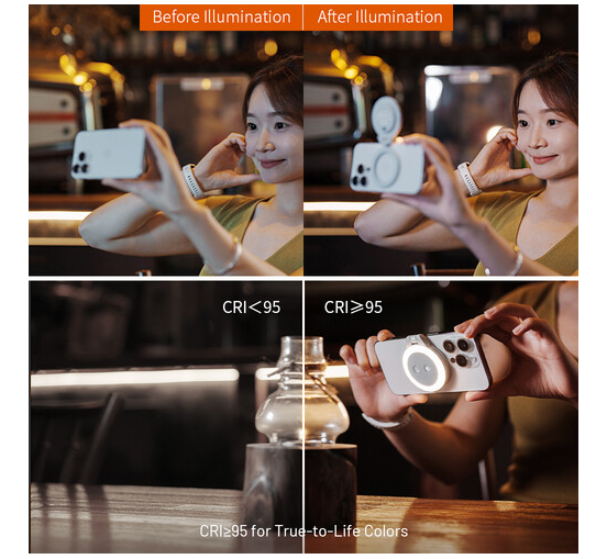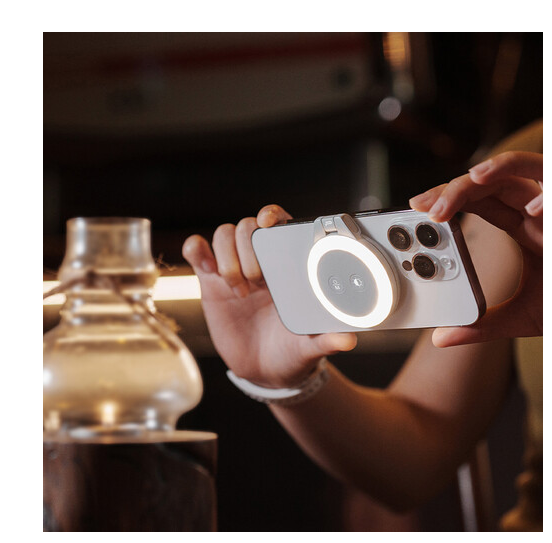 Mit 34 hocheffizienten LEDs mit einem CRI-Wert von 95 liefert das Licht eine farbgenaue Ausleuchtung in drei wählbaren Modi: 9000 K kaltes Licht für scharfe Details, 5500 K weiches Licht für natürliche Selfies und 2500 K warmes Licht für Abend- oder Dämmerungsstimmungen. Die 290°-Drehbarkeit sorgt für flexible Beleuchtungswinkel, während zwei intuitive Tasten die Helligkeit und Farbtemperatur steuern. Der integrierte 300-mAh-Lithium-Ionen-Akku ermöglicht eine kontinuierliche Nutzung von bis zu 30 Minuten und lässt sich über USB-C in nur 60 Minuten vollständig aufladen. Das MagGlow dient gleichzeitig als Handyhalterung für die Betrachtung oder Aufnahme auf dem Tisch.