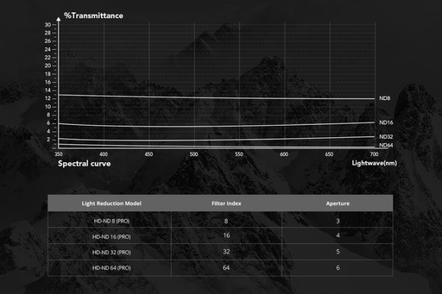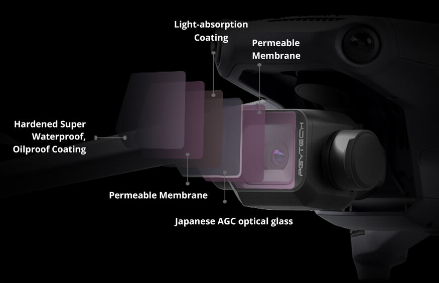 Jeder Filter besteht aus doppelt beschichtetem japanischem AGC-Optikglas und ist für einen niedrigen Brechungsindex geschliffen und poliert, um eine genaue Farbwiedergabe und scharfe Bilder sowohl für Fotos als auch für Videos zu gewährleisten. Die wasserfesten, ölbeständigen und kratzfesten Beschichtungen schützen das Glas in anspruchsvollen Flugumgebungen. Die Filter sind in einem leichten, CNC-gefrästen Aluminiumrahmen untergebracht, korrosionsbeständig und präzise konstruiert, um während des Fluges die richtige Gimbal-Balance aufrechtzuerhalten.