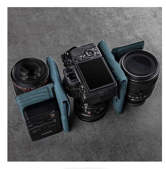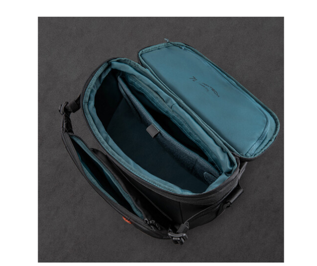 Für zusätzliche Vielseitigkeit kann der mittlere Teil geöffnet und angehoben werden, um das Fassungsvermögen der Tasche von 7 l auf 9 l zu erweitern. Im erweiterten Modus bietet die Tasche Platz für eine Kamera mit einem vertikal montierten 70–200-mm-Objektiv, ein zusätzliches Objektiv und ein iPad Pro mit einer Größe von bis zu 11 Zoll. Im Inneren schützen verstellbare, gepolsterte Trennwände Ihre Ausrüstung, während die Batterietasche mit Ladeanzeige dabei hilft, geladene und leere Batterien effizient zu verwalten.