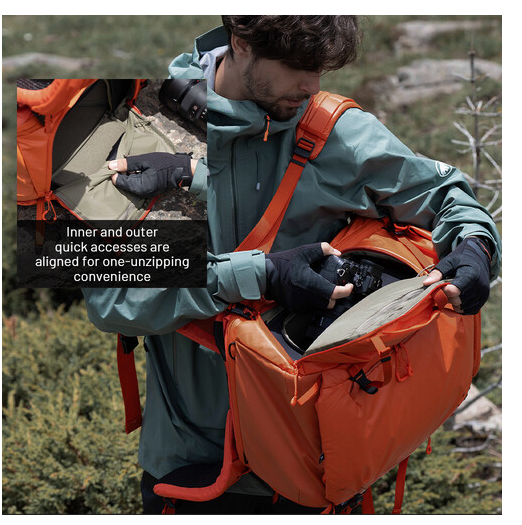 Der Rucksack besteht aus PU-beschichtetem Cordura-Material und ist wasserabweisend sowie strapazierfähig. Der 3D-Bogenrahmen aus Luftfahrtaluminium sorgt für Struktur und Stabilität, während die 3D-geformten Schulter- und Hüftgurte sowie das ergonomische Air-Mesh-Rückenteil für langen Tragekomfort sorgen. Der schnelle seitliche Zugriff und die seitlichen Wasserflaschentaschen sorgen für zusätzlichen Komfort während der Aufnahmen, und die 4-stufig verstellbare Rückenlänge ermöglicht eine individuelle Anpassung an verschiedene Körperformen.