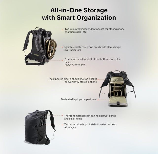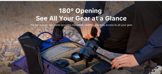 Das innovative Schnellzugriffsfach an der Seite, ein wesentliches Unterscheidungsmerkmal zu anderen leichten Fotorucksäcken, ermöglicht es Ihnen, Ihre Kamera in Sekundenschnelle zu entnehmen, ohne den Rucksack abnehmen zu müssen.