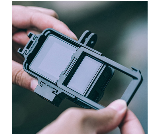 Der PGYTECH-Kamerakäfig für Osmo Action bietet ein passgenaues Design mit mehreren Zubehörhalterungen, an denen Sie Mikrofone, Leuchten und Griffe befestigen können, während Sie weiterhin uneingeschränkten Zugriff auf den Bildschirm und die Bedienelemente der Kamera haben.