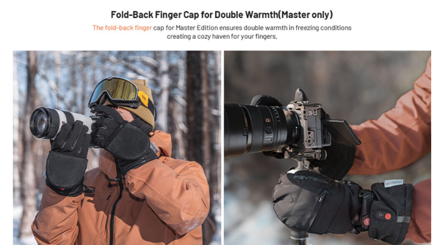 Die batteriebeheizten Master Photography Handschuhe PGYTECH P-GM-202 wurden für Fotografen entwickelt, die unter rauen Winterbedingungen arbeiten. Die Handschuhe sind mit Graphen-Heiztechnologie ausgestattet und bieten schnelle und gleichmäßige Wärme in drei Temperatureinstellungen. Sie werden mit zwei 4000-mAh-C-Zellen-Batterien betrieben, bieten eine längere Heizleistung und können sogar als Notfall-Powerbanks für Ihre Geräte dienen.