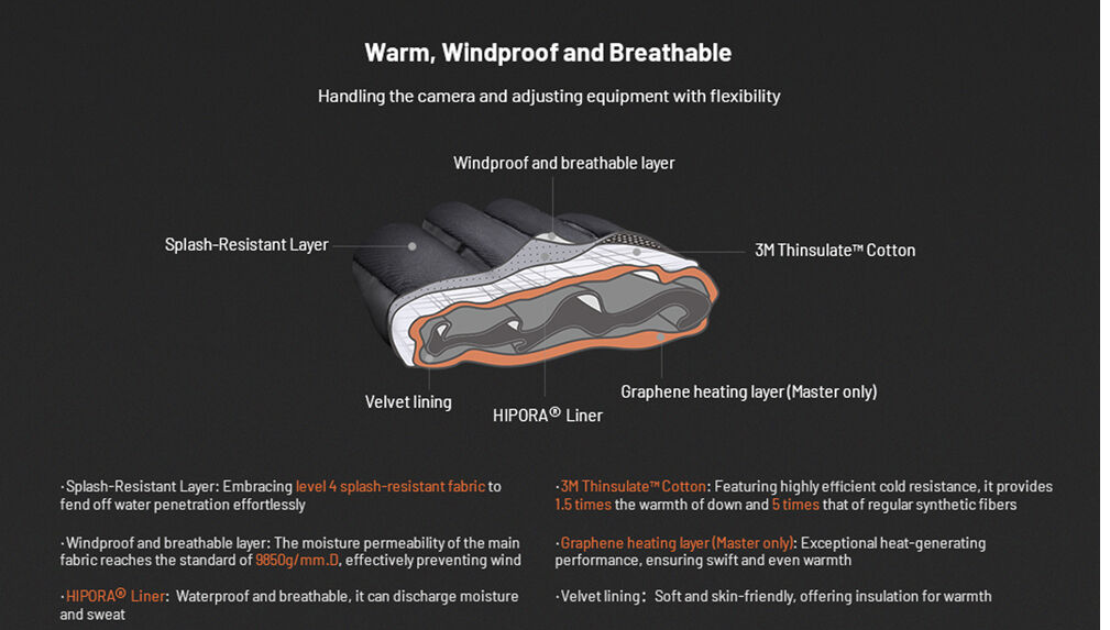 Die Handschuhe kombinieren 3M Thinsulate-Baumwolle, ein wasserdichtes und atmungsaktives HIPORA-Futter, eine winddichte Schicht und spritzwassergeschütztes Material, um Ihre Hände vor Kälte, Wind und Feuchtigkeit zu schützen. Die gepolsterten Lederhandflächen und die SBR-Polsterung verbessern die Griffigkeit und den Komfort, während das Samtfutter für Weichheit und Isolierung sorgt. Zurückklappbare Fingerspitzen ermöglichen einen einfachen Zugriff für präzise Kamerasteuerung, und ein Anti-Verlust-Handgelenkband und eine Schnalle halten die Handschuhe sicher und zusammen. Diese Handschuhe sind ideal für extreme Temperaturen von -31 bis 32 °F (-35 bis 0 °C) und der ultimative Begleiter für Outdoor-Fotografie im Winter.
