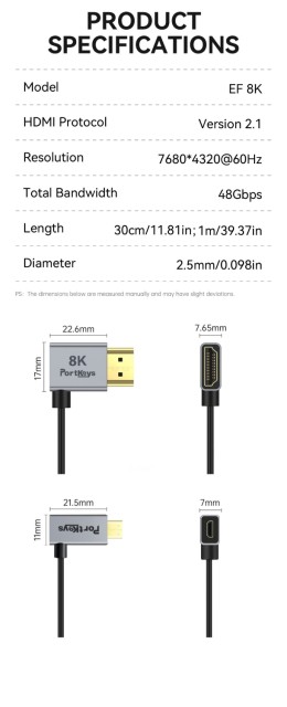 Mit einer Länge von 1 Meter bietet dieses Kabel Flexibilität und sorgt gleichzeitig für ein sauberes und organisiertes Setup. Die robuste Konstruktion sorgt für ein stabiles Signal mit minimalen Interferenzen und ist damit ideal für Filmemacher, Fotografen und Produzenten von Inhalten, die eine zuverlässige Leistung in hochauflösenden Workflows benötigen. Ganz gleich, ob Sie Filmaufnahmen machen oder Inhalte auf einem externen Monitor überprüfen, das Portkeys 8K HDMI-Kabel liefert kompromisslose Qualität.
